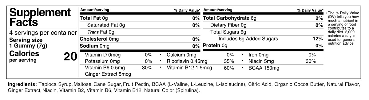 Ingredients: Tapioca Syrup, Maltose, Cane Sugar, Fruit Pectin, BCAA, Citric Acid, Organic Cocoa Butter, Natural Flavor, Ginger Extract, Niacin, Vitamins B2, B5, B12, Natural Color.